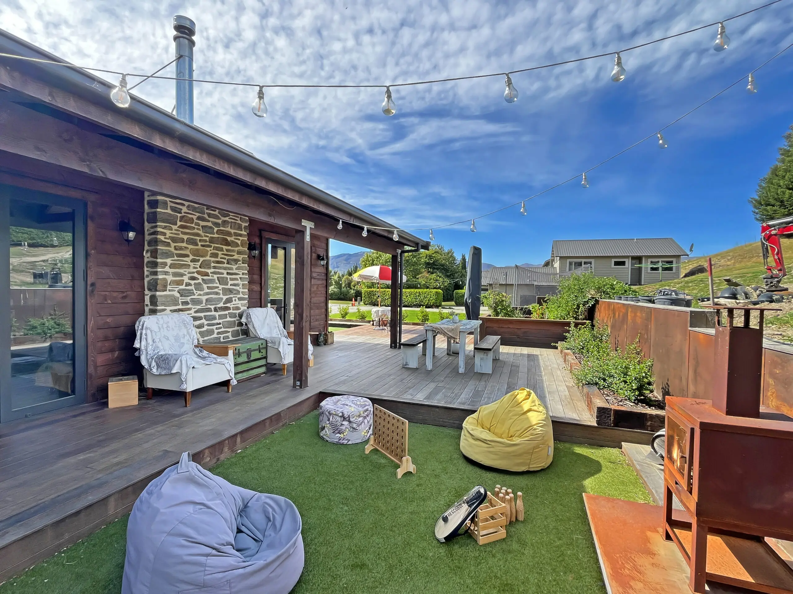 Outside, the expansive deck creates the perfect place to enjoy the fresh Central Otago air and surrounding views. You can gather around the outdoor fireplace in the “Pinot Pit,” relax in the open outdoor spaces, or enjoy a friendly game on the pétanque court — a fitting addition for a stay located in wine country.